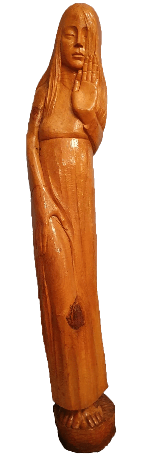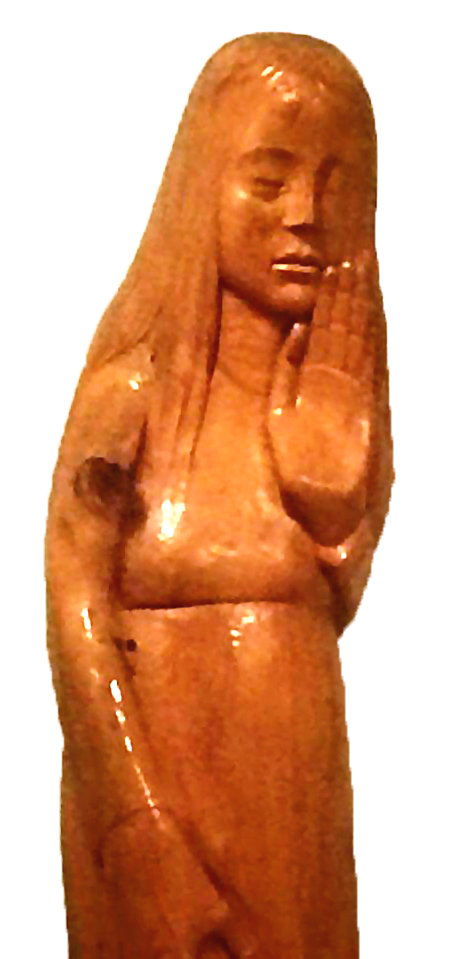 This statue, sculptured in pine wood deals with looking at the future.